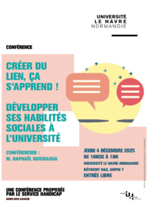 L’Université Le Havre Normandie et son Service Handicap organisent, en collaboration avec le Pôle Vie Étudiante, une conférence intitulée « Créer du lien, ça s’apprend ! », le jeudi 4 décembre 2025, de 16h30 à 18h, à l’Amphi 7 du bâtiment Humanités & Sociétés. Animée par le psychologue Raphaël Guichaoua, cette rencontre abordera les habilités sociales, essentielles pour bien communiquer, s’intégrer et éviter l’isolement au sein de la communauté universitaire.