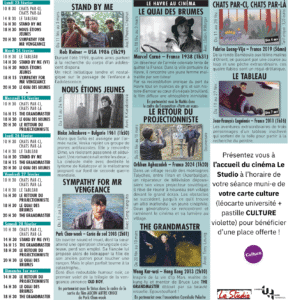 Pendant les vacances de février, du lundi 23 février au dimanche 1er mars 2026 inclus, grâce à votre carte culture, profitez du cinéma Le Studio : toutes les séances sont offertes !