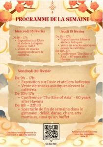 Tout au long de la semaine, de 9h à 17h, des snacks asiatiques seront proposés à la vente devant la cafétéria. Une occasion conviviale de découvrir de nouvelles saveurs et de prolonger l’expérience culturelle.